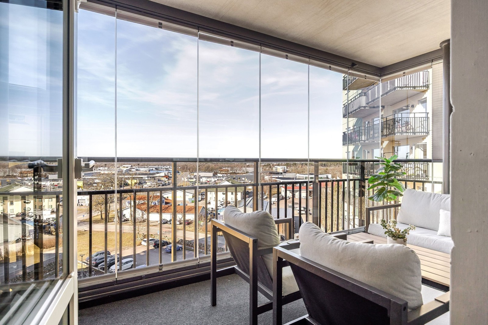 Stor inglasad balkong med eftermiddags/kvällssol.