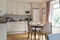 Från hallen når du köket som går i öppen och social planlösning med allrummet. Ljus köksinredning med vitt kakel ovan mörk bänkskiva. Köket bjuder på bra skåpsförvaring, spis, fläkt, diskmaskin, inbyggd mikrovågsugn och kyl/frys. Här finns dessutom plats för matgrupp om ca 4 personer.