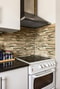 Ljust och rymligt kök med vit köksinredning. Köket är utrustat med spis, fläkt och kyl/frys.