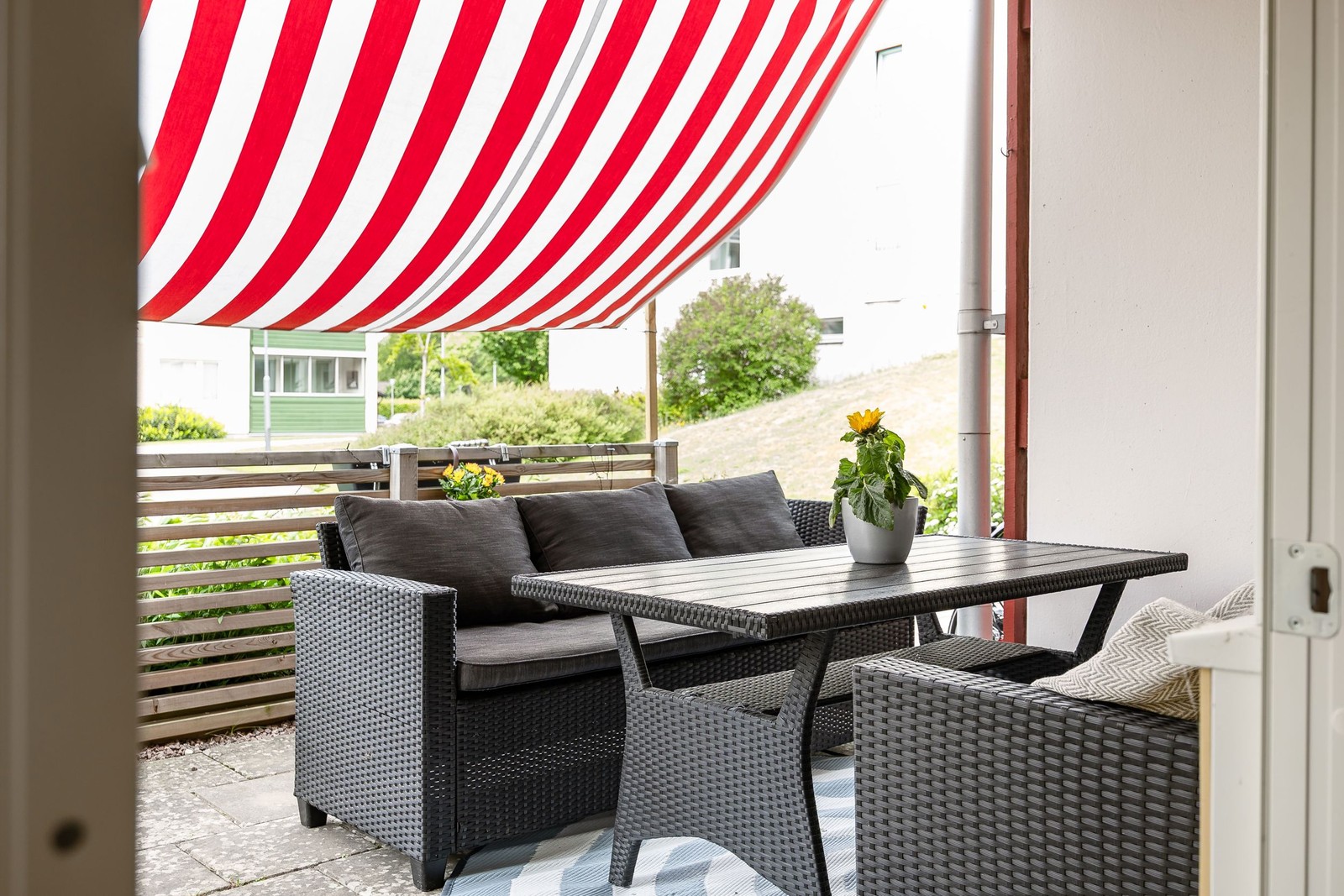 Via vardagsrummet når du den stenlagda uteplatsen med praktisk markis.