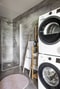 Smakfullt renoverat badrum med grå våtrumsmatta och gråa väggar. Badrummet är utrustat med toalett, dusch, handfat med tillhörande kommod och spegelskåp samt tvättmaskin och torktumlare.