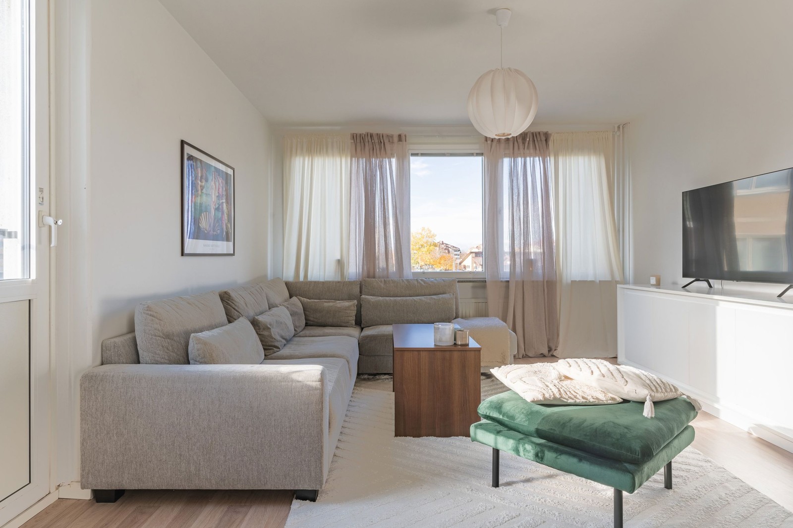 Renoverad markplanslägenhet med gavelläge och ljusa ytor i Djurängen