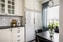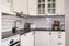 Via allrummet når du köket med vit köksinredning och vitt kakel ovan bänkskiva. Köket är utrustat med spis, fläkt, integrerad diskmaskin och kyl samt frys.