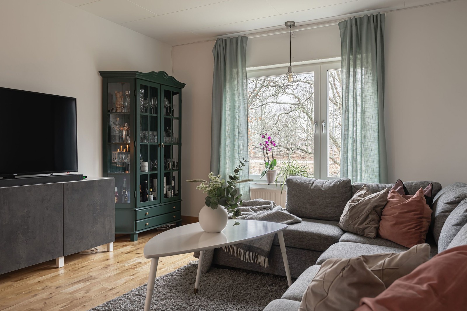 Ljust och luftigt vardagsrum som fokuserar på umgänge med plats för större möblemang. Tack vare fönster i två väderstreck ges ett rikligt ljusinsläpp som gör trivseln hög.