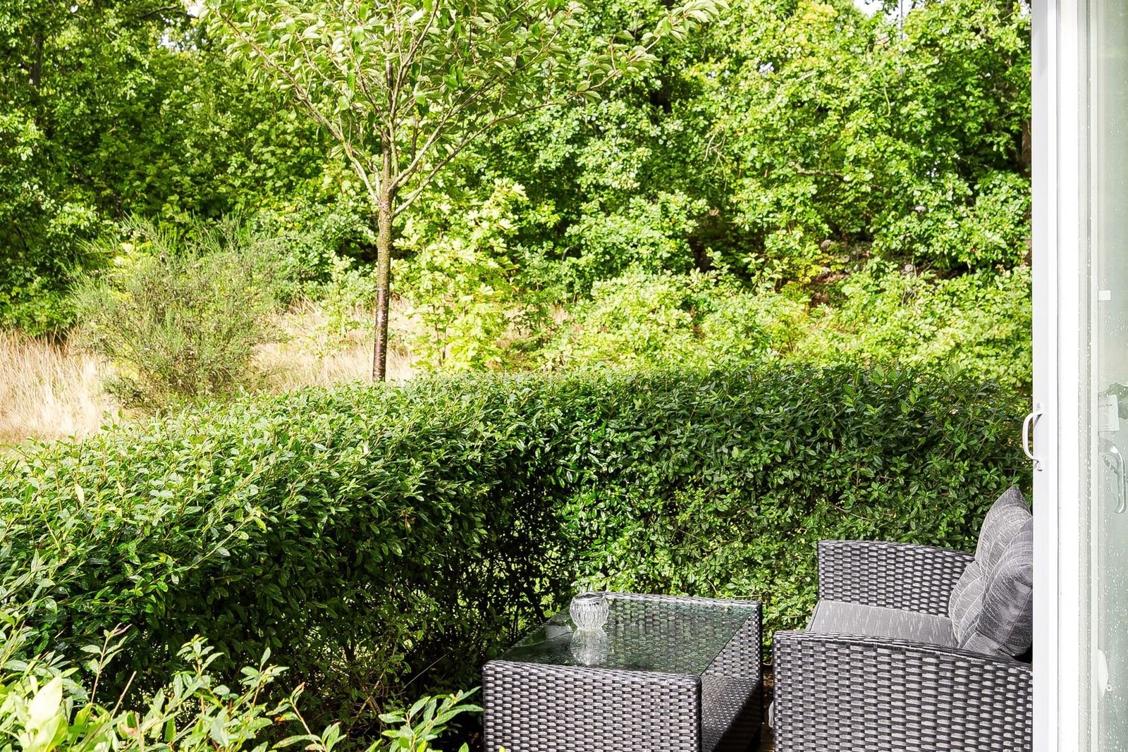 Härlig uteplats i soligt och skyddat läge mot skogsparti. Här finns gott om plats för ett välkommet utemöblemang.