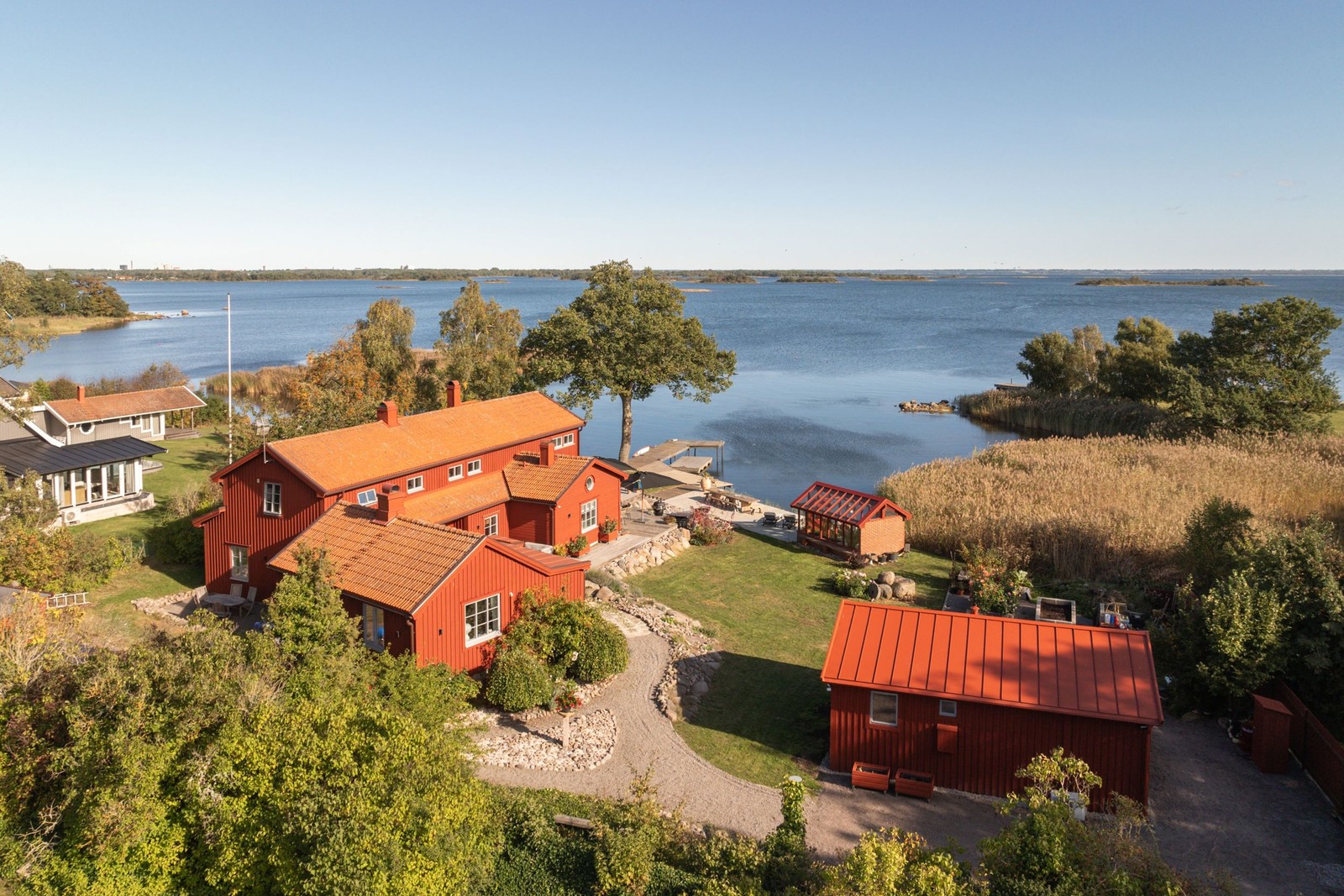 En stilla sommarkväll härute är atmosfären snudd på magisk när livet längs halvöns strandlinje stillnar. Den lilla vikens rödblanka vågor slår mot stranden och skvalpar mot bryggornas pålar, knappt tio meter ner. Breda, ännu solvarma, trätrappor leder ner till terrassytor i olika etage som övergår i bryggorna. Sjöluften blandas med blomdoft och nyklippt gräs och gästerna letar sig längst ut på båt- och badbryggan där barnen tar ett sista dopp. Bryggans vattendjup klarar en motorbåt på upp till 23 fot. När mörkret har fallit glittrar ljusen på andra sidan vattnet och ångan stiger mot stjärnhimlen från trädäckets integrerade spabad.