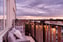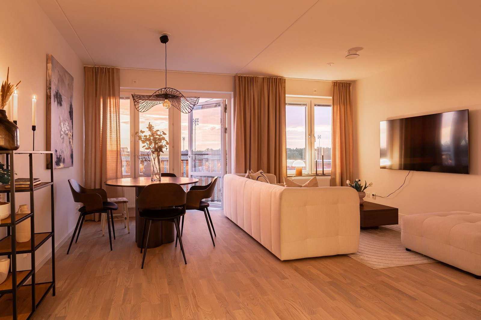 Exklusiv våning högst upp med balkong, kvällssol och utsikt över stad och vatten