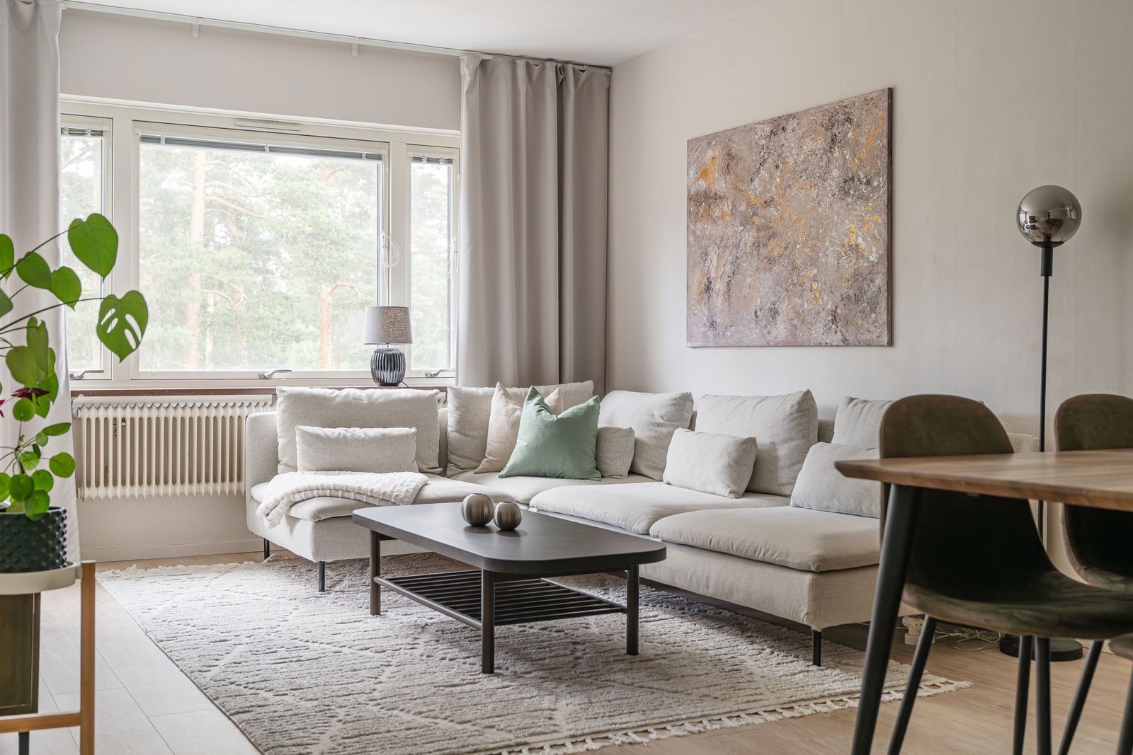 Direkt till höger från hallen når du det tilltagna vardagsrummet som går i en behaglig ljus nyans. Här finns plats för större möblemang, perfekt för umgänge. Dessutom når du den mysiga balkongen som nuvarande ägare haft stor glädje utav.