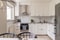 Stilren vit köksinredning med vitt kakel ovan ljus bänkskiva. Köket är utrustat med spishäll, fläkt, ugn, integrerad diskmaskin och kyl/frys. Här finns dessutom plats för större matgrupp.