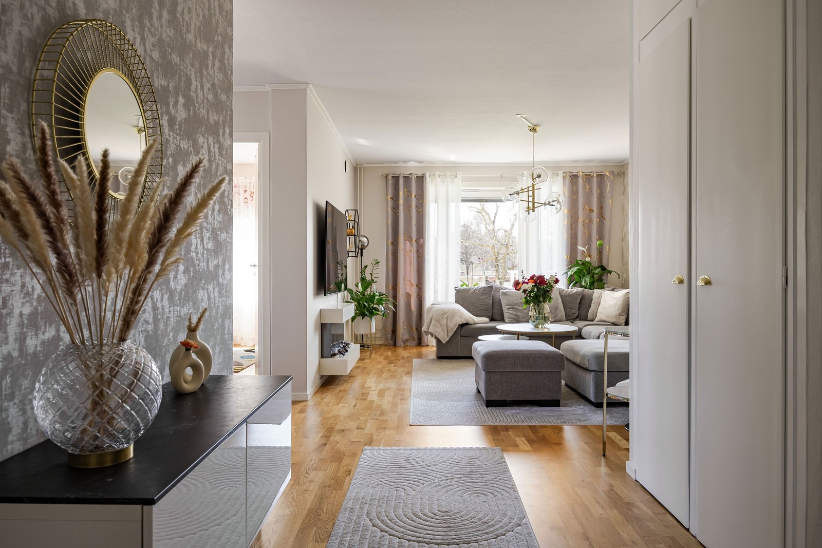 Välkomnande och ljus hall med goda förvaringsmöjligheter i garderober.