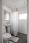 Grå klinker och vitt kakel samt fint ljusinsläpp från fönster. Badrummet är utrustat med toalett, dusch, handfat och spegel.