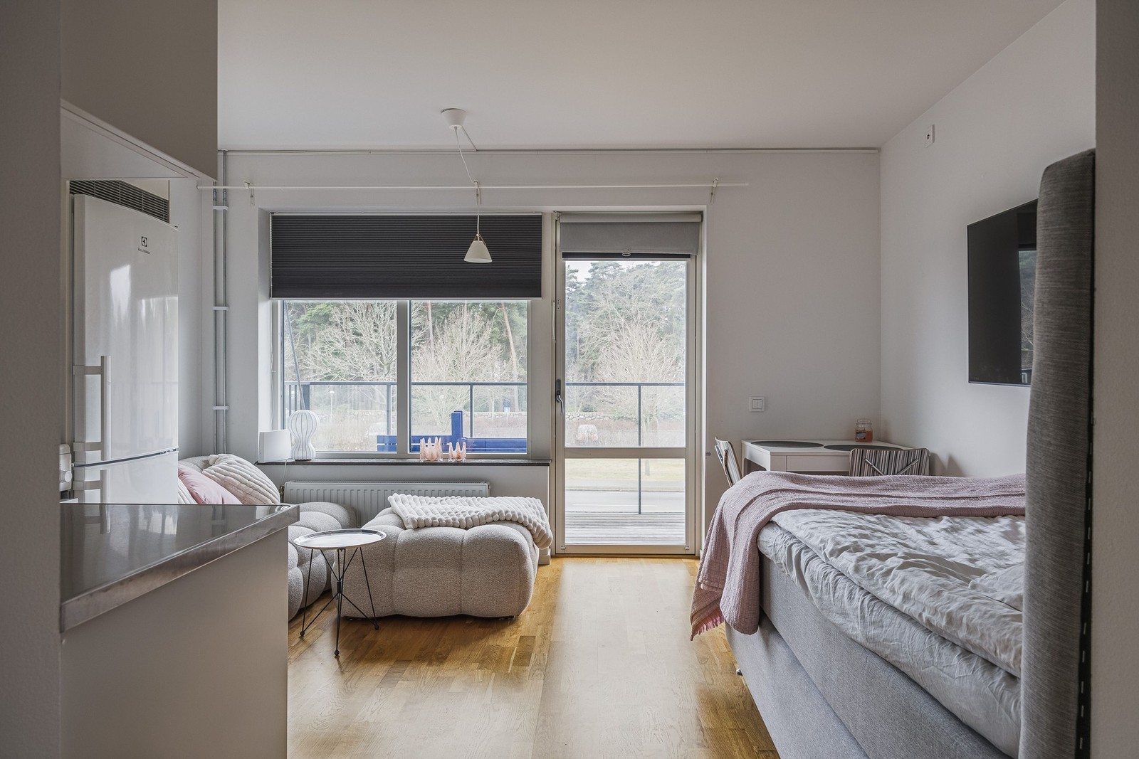 Här får du en smart planerad bostad där varje kvadratmeter utnyttjas optimalt. De generösa fönsterpartierna ger ett fantastiskt ljusinsläpp, och de stilrena ytskikten bidrar till en modern och fräsch känsla. Från balkongen kan du njuta av sol större delen av dagen samtidigt som du blickar ut över omgivningen. Köket är välplanerat med gott om arbetsyta och förvaring, och tack vare den öppna planlösningen mot vardagsrum och sovdel känns bostaden både rymlig och social. Hallen har bra förvaringsmöjligheter, och det delvis kaklade badrummet är utrustat med en tvättmaskin med torkfunktion för extra bekvämlighet.