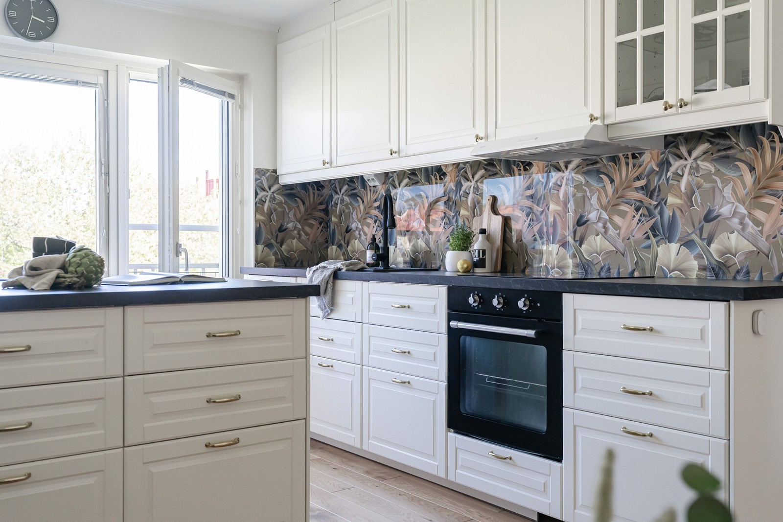 Köket i öppen planlösning mot sällskapsdelen. I tillräckligt bra storlek med extra bra förvaringsutrymmen. Bakom en utav luckorna gömmer sig en tvättmaskin vilket underlättar vardagen. Övrig maskinell utrusning: Kyl/frys, ugn, häll, fläkt samt diskmaskin!