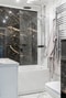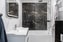 Renoverat och helkaklat badrum med stora 60X60 kakelplattor. Nya speglar och badrumsmöbler. Här finns badkar, wc, handfat och handdukstork.
