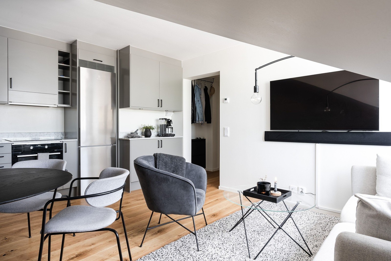 När du kliver in genom dörren välkomnas du av hallen som erbjuder ett trevligt första intryck och smakfullt parkettgolv som sträcker sig genom hela lägenheten. Rakt fram ligger det delvis kaklade badrummet och till vänster det stora sovrummet med bra förvaring. Hemmets 35 kvadratmeter är extremt väplanerade och här nyttjas varje kvadratmeter på absolut bästa sätt. Hemmets hjärta är helt klart den öppna planlösning med kök och sällskapsrum som skapar en social och inbjudande yta för umgänge och avkoppling. Här kan du med gott samvete tillbereda kvällens middag utan att behöva missa de spännande samtalen från soffgruppen. De fina ytskikten ger en känsla av lyx, välkomnande atmosfär och tack vare välplacerade fönster finns genomgående rikt ljusflöde.