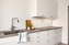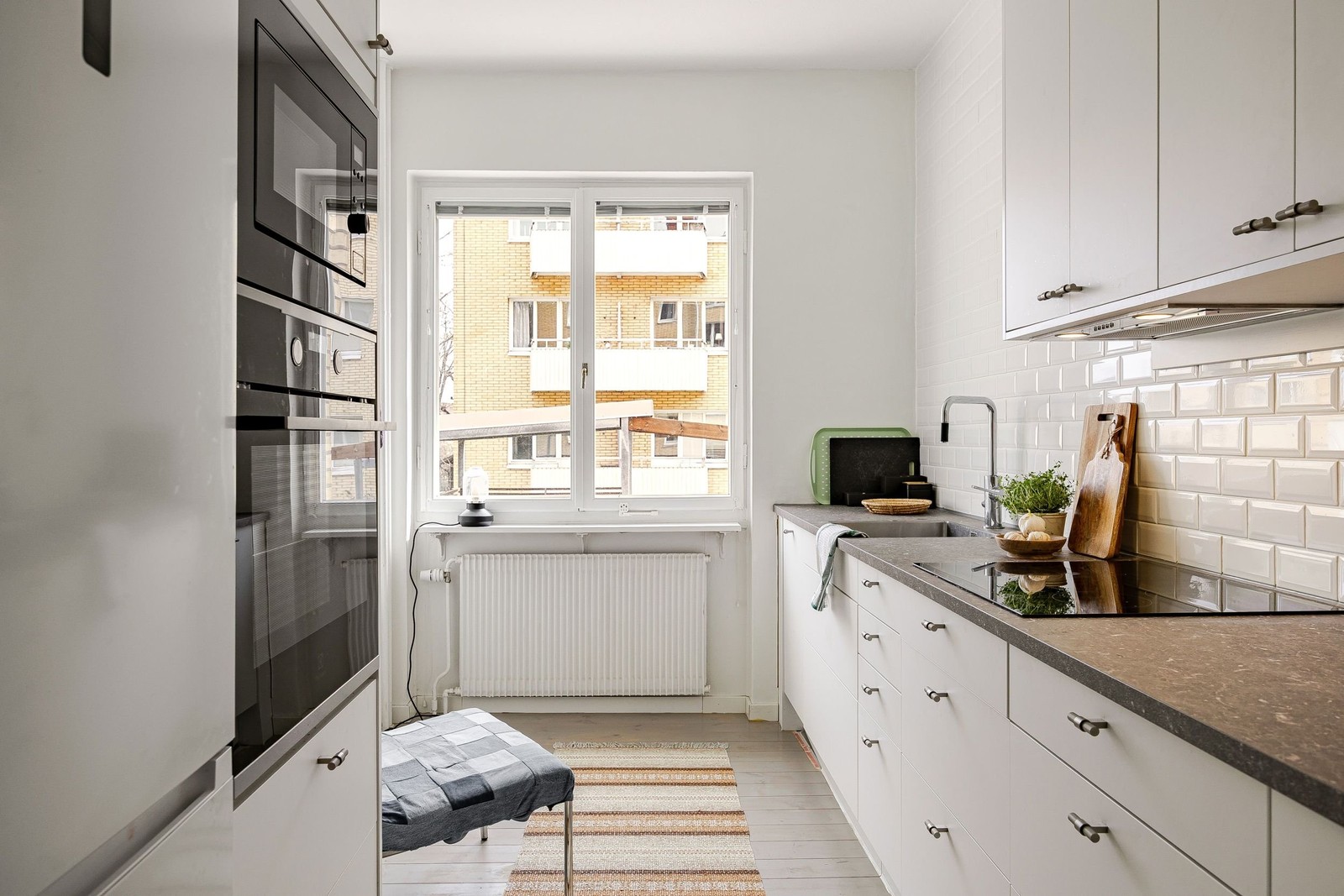 Ljust brädgolv och vita väggar. Ljus köksinredning från kvalitativa Marbodal, med vitt kakel ovan mörk bänkskiva. Köket är utrustat med kyl/frys, integrerad diskmaskin, induktionshäll, fläkt, inbyggd ugn och mikrovågsugn.