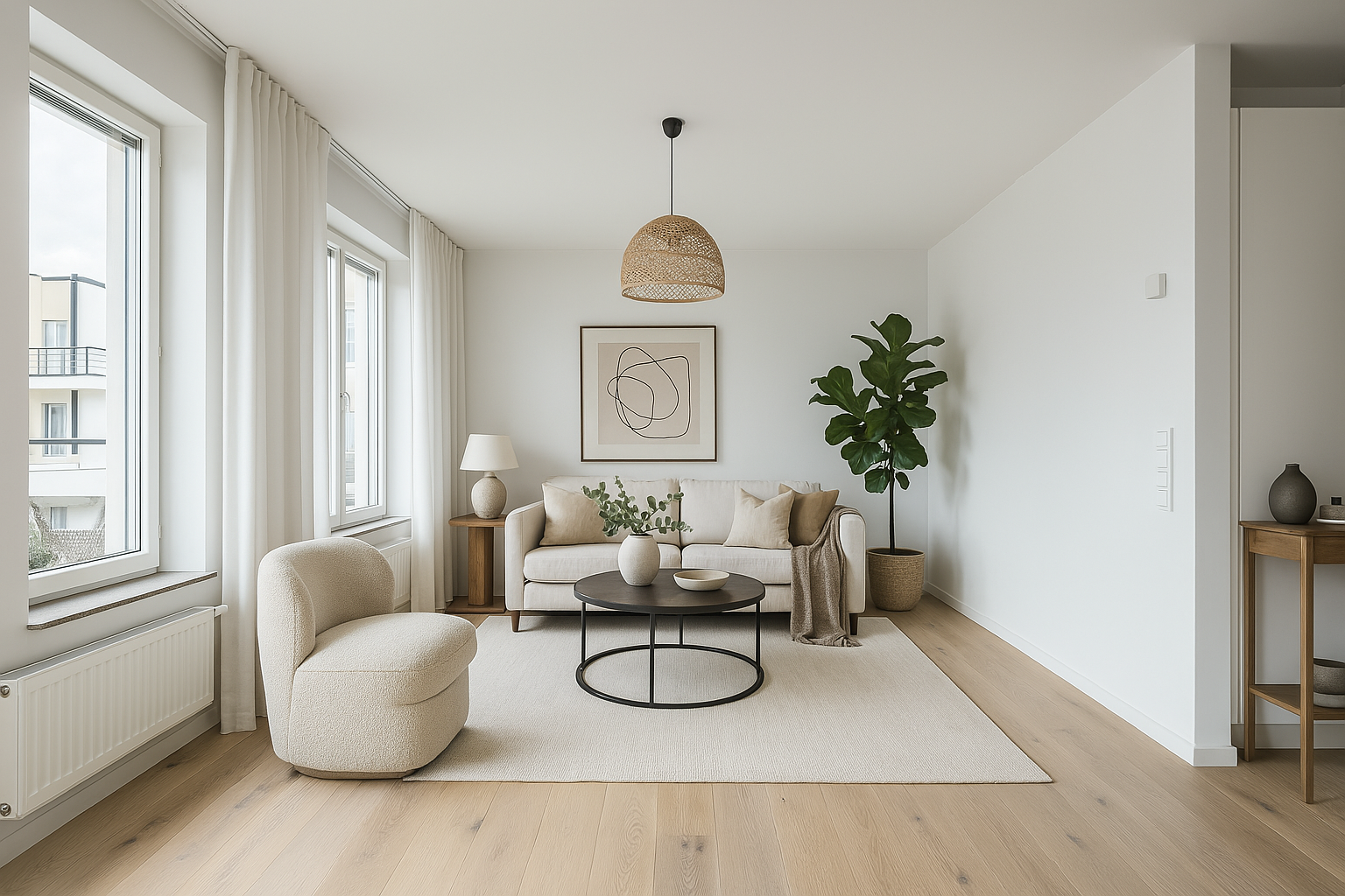 Vardagsrummet är ljust och luftigt med stora fönster som släpper in gott om dagsljus. Rummet erbjuder generösa ytor för både avkoppling och sällskap, med plats för såväl soffa som läshörna.