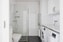 Stilrent badrum med helkaklade väggar och praktiskt fönster som släpper in naturligt ljus. Här finns dusch, wc, handfat med kommod, spegelskåp samt tvättmaskin och torktumlare under en praktisk arbetsbänk – allt du behöver för en smidig vardag.