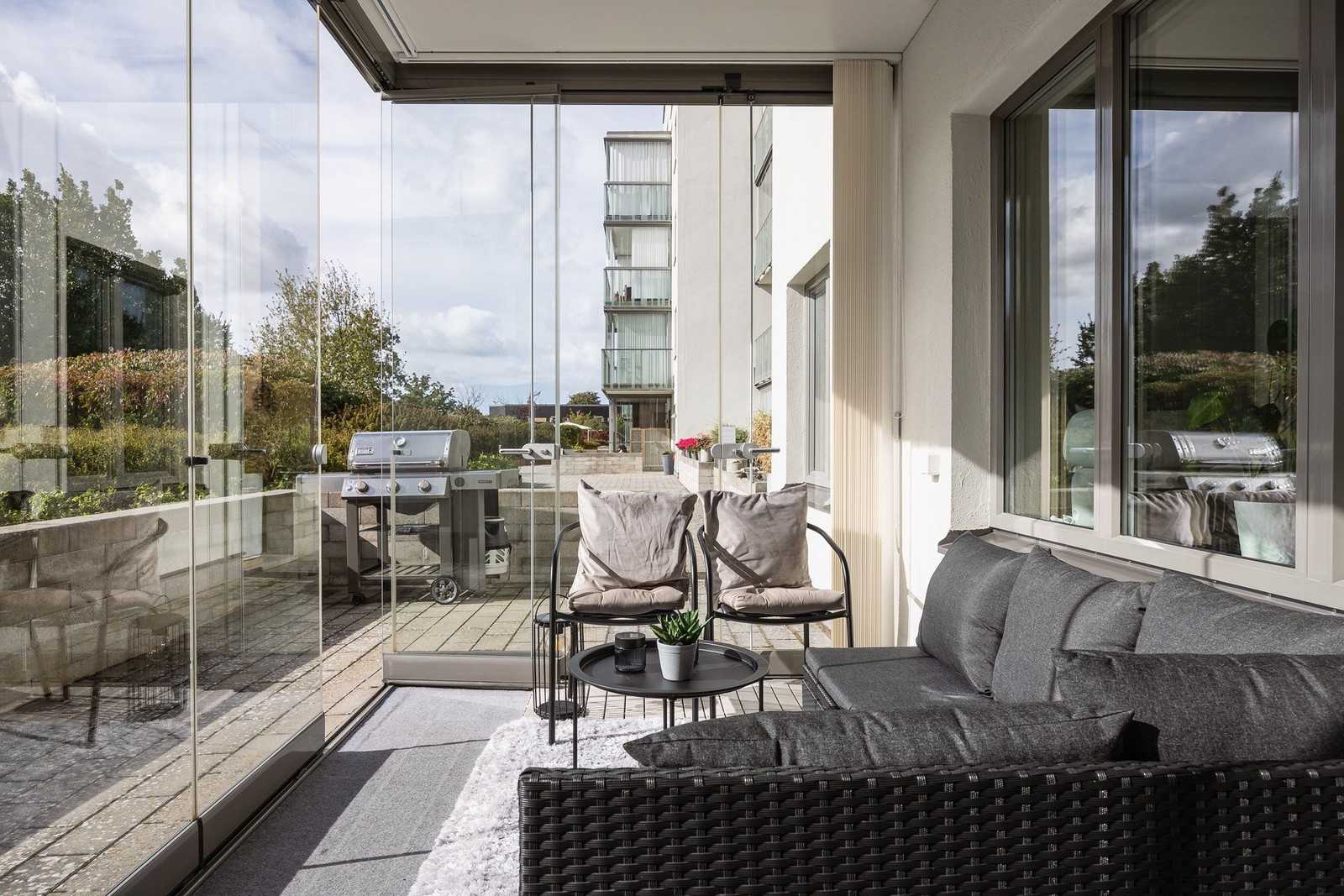 Den delvis inglasade uteplatsen blir en naturlig förlängning av vardagsrummet och bjuder in till avkoppling året runt. Här kan du njuta av morgonkaffet i lä och skydd från vind, samtidigt som den öppna delen ger plats för solstolar, blomkrukor eller grillkvällar under sommarhalvåret. En perfekt kombination av praktiskt och trivsamt – en egen liten oas med villakänsla mitt i stan.