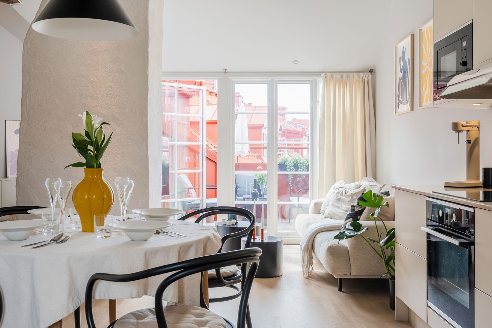 Redan när du tar klivet in i den knallgula fastigheten som stoltserar i hörnet av Nygatan och Stagneliusgatan vet du att detta är en bostad som kommer att golva dig totalt. Via det karaktäristiska trapphuset i härlig 20-talsanda välkomnas du av den ljusa och luftiga hallen. Du tar dig direkt in till den sociala delen av bostaden, där kök och vardagsrum vackert smälter samman i en öppen och social planlösning. Detta är otvivelaktigt hemmets hjärta som ger plats för både middagsbord och soffmöblemang. Hit bjuder du med fördel vänner och familj; alla får plats! Rummen bjuder på ett magiskt ljusflöde tack vare fönster i två väderstreck. Vid köksfönstret finns en trevlig sittplats med praktisk förvaring och i andra delen av rummet stoltserar ett stort fönsterparti som sträcker sig från golv till tak, utsmyckat med fina spröjs. Här finns dessutom utgång till den privata vindsbalkongen som trivsamt är infälld från taket, där charmen är total med den röda plåten som viker ner från taket och utsökt kombineras med gröna spröjsade fönster. Läget är inbäddat och skyddat samtidigt som det vetter mot föreningens lugna och lummiga innergård med utsikt över takåsarna. Balkongen ger plats för ett större utemöblemang, perfekt för alla mysiga stunder med nära och kära under ljuvliga sommardagar.