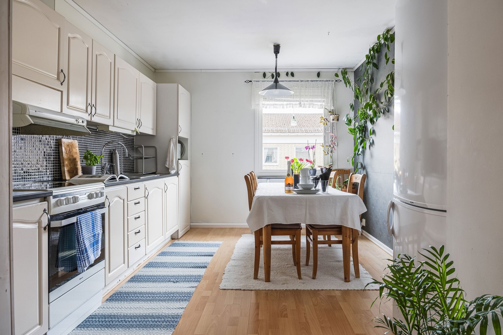 Hallen är välkomnande som ansluter till hemmets alla rum och bjuder på bra förvaringsmöjligheter i rymligt förråd/klädkammare samt garderob. Hjärtat i denna lägenhet är det smakfulla köket som går i en ljus nyans och som på ett fint sätt bryts av med mörkare stänkskydd och bänkskiva. Här ges plats för större matgrupp, perfekt att samla familj och vänner. Dessutom har en del av väggen tagits ned mellan köket och hallen, vilket ger en luftig känsla samt trivsam och social planlösning. Vardagsrummet är generöst och ger plats för större möblemang, härifrån når du också den inglasade balkongen som härligt vetter ut mot grönområdet och som fungerar som ett extra rum under sommarhalvårets alla varma månader. Därtill erbjuds ett rymligt sovrum som ger plats för större säng. Badrummet är stilrent helkaklat och bjuder på egna tvättmöjligheter som förenklar vardagsbestyren.