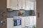 Ljus köksinredning med mörkt stänkskydd ovan bänkskiva. Köket är utrustat med spis, fläkt och kyl/frys. Här finns plats för större matgrupp.