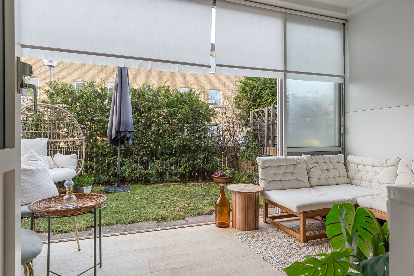 Inglasat uterum med tillhörande trädgårdstäppa erbjuder en härlig plats att njuta av både ljus och grönska året om. Uterummet är ljust och rymligt, perfekt för avkoppling eller umgänge. Direkt utanför väntar en charmig trädgård med plats för odling, lek eller bara lugna stunder i solen. En trivsam kombination för både vardag och fest.