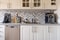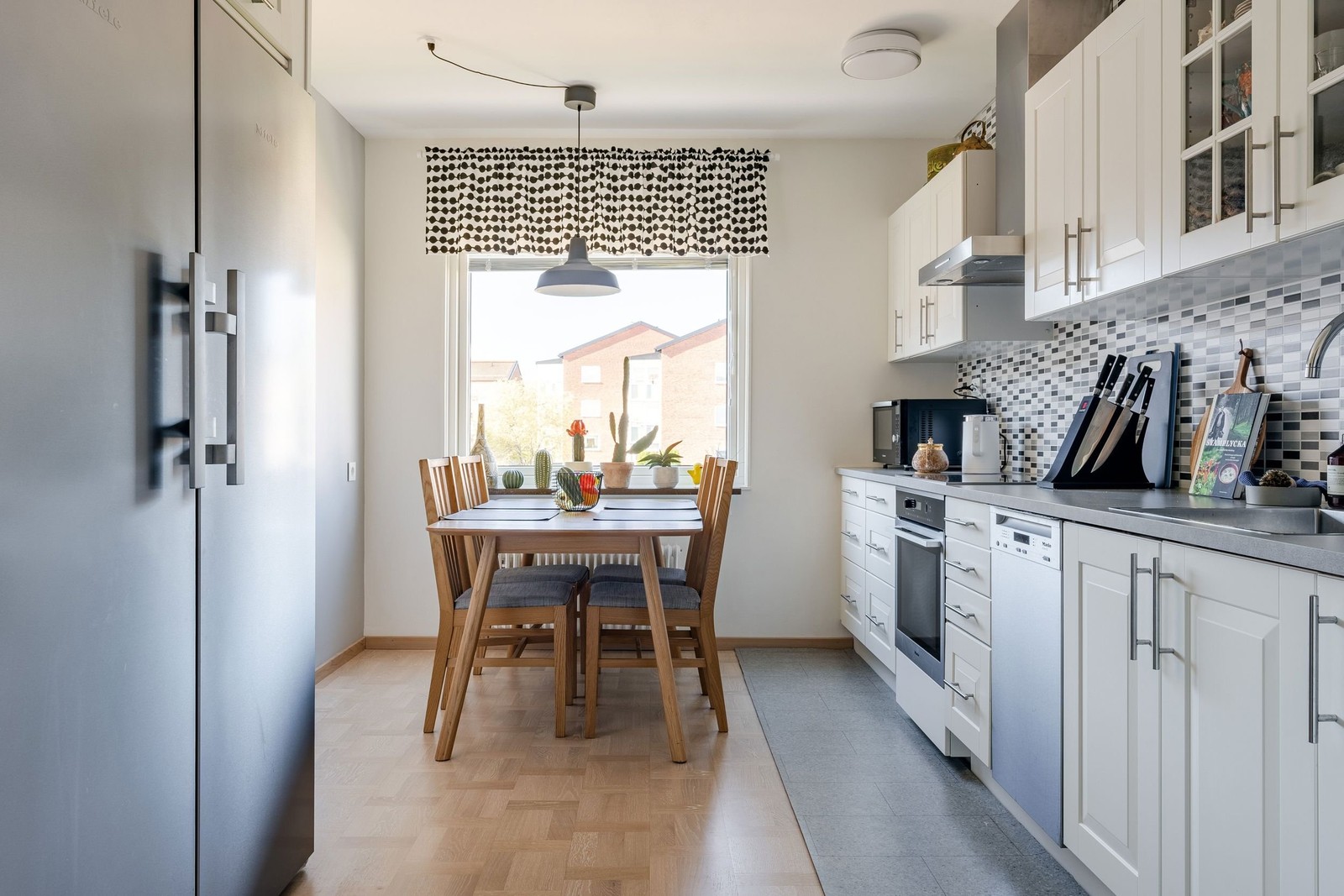 Direkt till höger från hallen ligger köket trivsamt beläget, med vita väggar och grå fondvägg samt ljus köksinredning. Köket är utrustat med spishäll, fläkt, ugn, diskmaskin och hel kyl och frys (Miele).