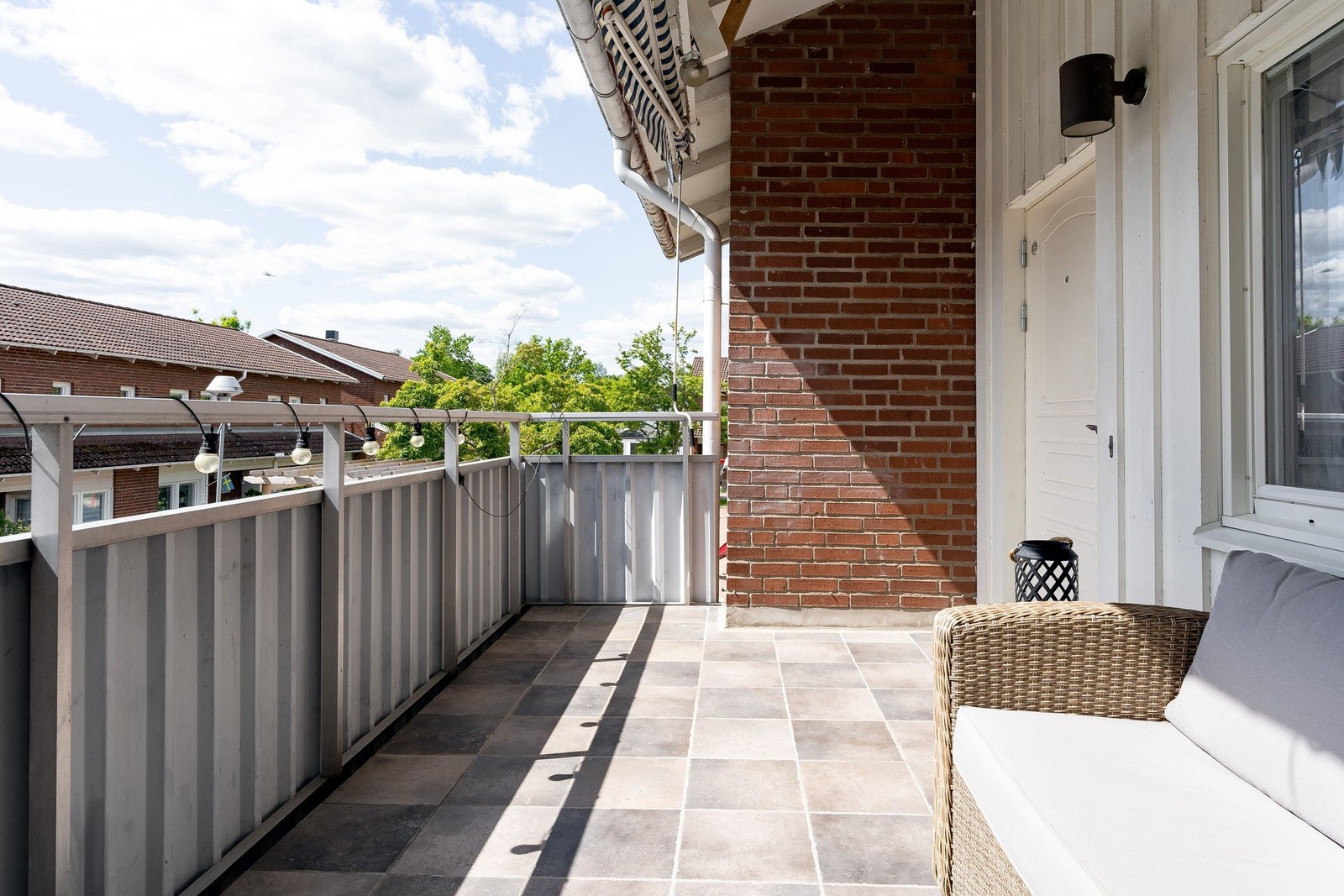 Vid entren till hemmet ligger den soliga balkongen som har utrymme för ett fint utemöblemang.