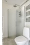 Ett kompakt men välplanerat badrum där varje kvadratmeter är smart utnyttjad. Här finns dusch, toalett, handfat och förvaringsskåp. Dessutom är det förberett för tvättmaskin – med möjlighet att installera en vid handfatet om du önskar. För den som föredrar gemensam lösning finns tvättstugan bekvämt tillgänglig i huset.