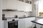 Till höger om hallen ligger köket – stilrent, praktiskt och hemtrevligt på samma gång. Här finns gott om både arbetsyta och förvaring, och det nylagda fiskbensmönstrade golvet ger rummet karaktär. Väggarna är målade i vitt och det stora fönstret bjuder in ett härligt dagsljus. Köket är utrustat med spis med häll, kyl/frys, fläkt och – den stora vardagslyxen – diskmaskin.
