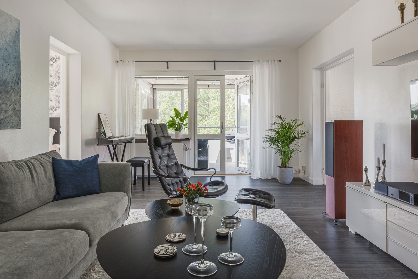 Luftigt och rymligt vardagsrum med härlig social yta som ger plats för större möblemang. Härifrån når du dessutom den inglasade balkongen i härligt solläge med fantastisk vy över den lummiga omgivningen.