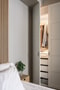 Via de smakfulla industriväggarna når du lägenhetens sovavdelning – en avskild och rofylld del av hemmet. Här kombineras stilrena material med smart funktionalitet. Den ribbade träväggen bakom sängen ger en varm hotellkänsla, och de platsbyggda förvaringslösningarna bakom skjutdörrar maximerar varje kvadratmeter.