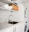 Det finns många saker att älska med lägenheten men köket i öppen planlösning med sällskapsrummet tar priset. Ljusflödet, utsikten och amtosfären är extraordinära. Här blir det sannerligen påtagligt att Varvsholmen och lägenheten är något utöver det vanliga. Likt hemmet i övrigt erbjuder rummet högkvalitativa material- och färgval, allt för att förstärka det rika ljusinsläppet. Möbleringsmöjligheterna är många och det finns gott om utrymme för soffa, fåtöljer och en stor middagsgrupp.