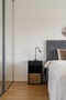 Via vardagsrummet nås lägenhetens störsat sovrum. Här finns gott om utrymme för dubbelsäng och dessutom erbjuds bra förvaring med skjutdörrsgarderob.