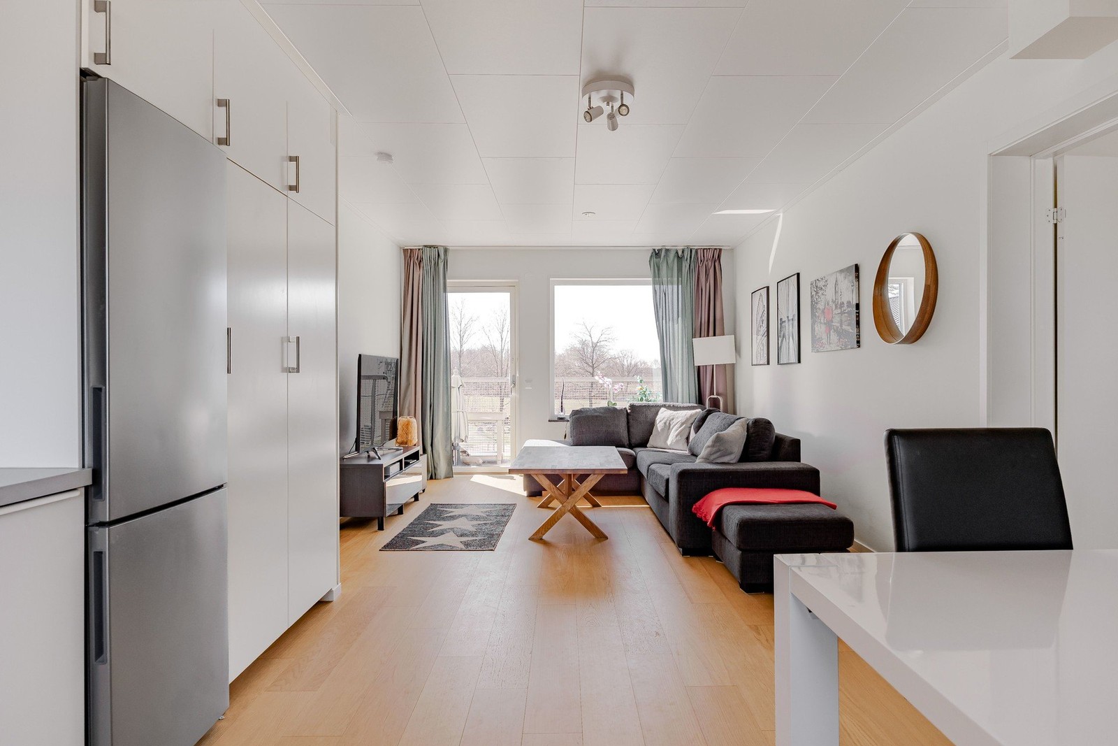 Lägenheten erbjuder en genomtänkt planlösning med sociala ytor och privata rum i bra balans. Det öppna sambandet mellan kök och vardagsrum skapar en inbjudande och luftig miljö, perfekt för både vardag och umgänge. Stora fönsterpartier släpper in rikligt med ljus och ger en fin kontakt med omgivningen. Från vardagsrummet nås balkongen – en perfekt plats för morgonkaffet eller kvällssolen.