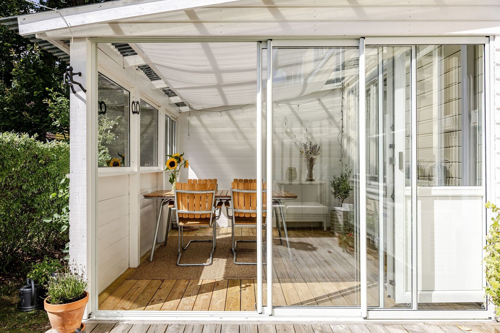 Via vardagsrummet når du den inglasade altanen, som förlänger hemmet och som leder vidare ut till trädäcket och uteplatsen.