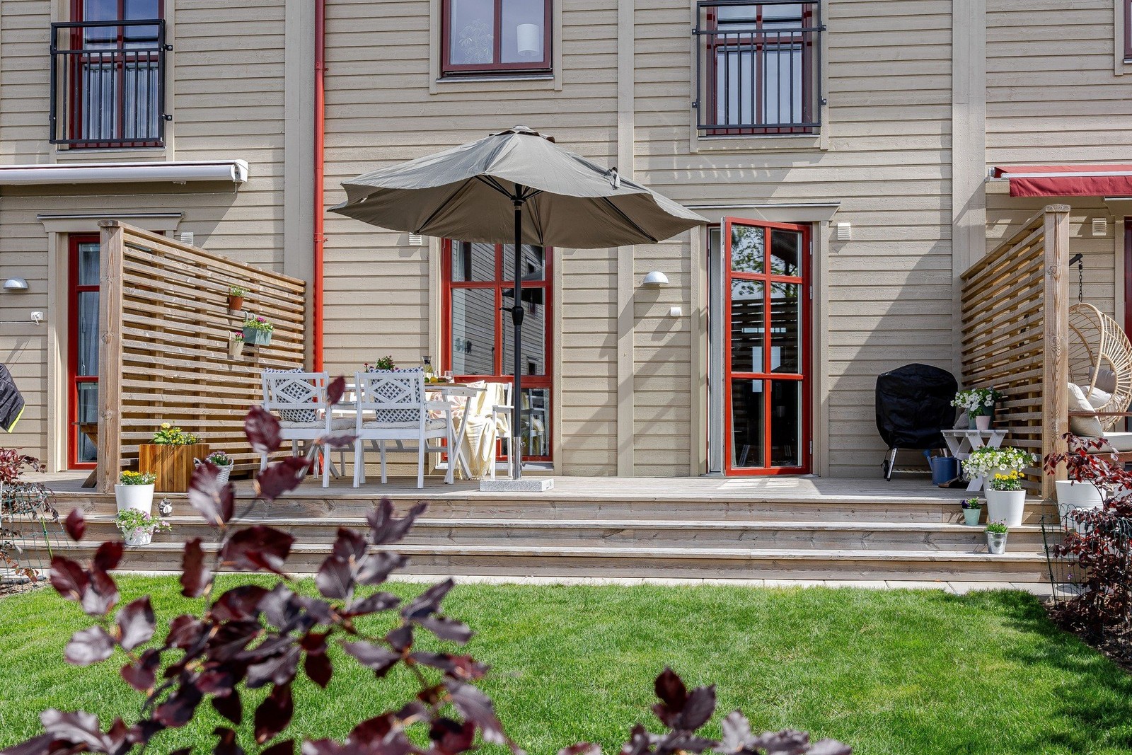 Från vardagsrummet leder en altandör ut till en privat uteplats med en egen trädgårstäppa, vilket ger en villakänsla. Här kan du njuta av soliga dagar, grilla och koppla av med vänner och familj.