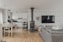 Vardagsrummet präglas av ett stort fönsterparti som släpper in rikligt med ljus och ger rummet en öppen atmosfär. Här finns gott om plats för soffa och övrig möblering efter behov. Den stilfulla kaminen blir ett naturligt nav i rummet.
