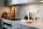 Kök i grått utförande. Skåpsförvaring i över- och underskåp. Ljusinsläpp från stort fönsterparti. Den maskinella köksutrustningen består av spishäll, spisfläkt, ugn, diskmaskin samt kyl och frys i fullhöjd.