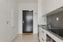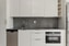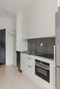 Det öppna köket har en köksinredning i vitt som samspelar fint med ljusa väggar och ett stilrent stänkskydd i grått. Här erbjuds goda arbetsytor och generös förvaring i både bänk- och väggskåp. Den maskinella utrustningen består av spishäll, spisfläkt, kombinerad ugn och mikrovågsugn samt kyl och frys, samtliga i rostfritt utförande. I anslutning till köket finns plats för ett matbord.
