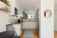 Köket är modernt och funktionellt utformat med en stilren inredning. Här ger både kaklet och bänkskivan i massiv ek en varm känsla. Här finns gott om förvaring i både under- och överskåp och arbetsytorna är generösa. Mot vardagsrummet löper en bardel som på ett naturligt sätt avgränsar köket samtidigt som den skapar en social länk mellan rummen. Det finns plats för ett matbord i köket. Den maskinella utrustningen i rostfritt utförande håller en jämn och stilren linje. Här finns ugn, spishäll, inbyggnadsmikro, köksfläkt, diskmaskin samt kyl och frys i fullhöjd.