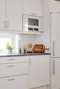 Köket kommer i en öppen planlösning och erbjuder sociala ytor. Färgen på luckorna är en fin vit nyans och skapar tillsammans med de vita kaklet en modern och stilren känsla. Golvet är ljust med vita väggar och ger köket en smakfull stil. Den maskinella utrustningen består av Kyl, frys, ugn, spis, diskmaskin, mikro samt köksfläkt. Här finns plats för en matgrupp.