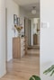 Välkomnade hall med ljusa väggar och vackert enhetligt golv i ljus ton som löper genom hela bostaden. Till vänster om entrédörren har man bra avhängningsmöjligheter och en garderob och rakt fram når man toaletten.
