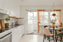 Trivsamt kök med köksinredning i ljus färgsättning. Här ges bra skåpsförvaring, bekväma arbetsytor samt plats för ett matbord. Kökets maskinella köksutrustningen består av diskmaskin, ugn med spis, spisfläkt samt kylskåp och frys. Från köket når ni bostadens balkong.