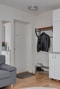 När man stiger in i lägenheten möts man av den ljusa och öppna planlösningen. Det finns en nyare säkerhetsdörr installerad och väggarna är målade i en ljus nyans och på golvet ligger ett enhetligt ljust golv. Till vänster finns avhängningsmöjligheter och en platsbyggd förvaringslösning med garderober och ett skåp med inbyggd frys. Rakt fram ligger dörren till badrummet. I rummet ligger köksdelen som blir naturligt avskild tack vare placeringen i ena hörnet. Den praktiska köksön ger extra arbetsytor och möjlighet för sittplats. Skåpen är vitmålade med inslag av vitrin. Kaklet har en ljusgrå färg. Köket är utrustat med inbyggnadsugn med ångfunktion, spishäll, spiskåpa och kyl. Över denna tillagningsyta sitter stilrena plattor i marmor. I vitrinskåpet sitter ett eluttag monterat för installation av mikro. Vid fönstret möblerar man gärna upp med en matgrupp och resterande yta har plats för lounge och TV.