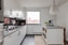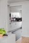 Ombonat kök med modern vit köksinredning. Grå bänkskiva och svarta kakelplattor satt som stänkpanel. Den maskinella utrustningen är i rostfritt utförande och består av integrerad diskmaskin, induktionshäll, köksfläkt, inbyggd ugn och mikrovågsugn samt kyl och frys i fullhöjd. På golvet ligger klinker och väggarna är ljusa.