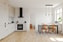 Köket inbjuder till samvaro och är smart planerat. Köksinredningen kommer i behaglig ljus kulör och erbjuder gott om arbetsytor och förvaringsmöjligheter. Den vackra bänkskivan i ljus ton är snyggt matchat mot det vita kaklet på väggen. Den maskinella köksutrustningen består av ugn, spishäll, spisfläkt och fläktkåpa. Både diskmaskin och kyl/frys är integrerad i inredningen och i ett av högskåpen är en tvättmaskin smart placerad. Väggarna är målade i ljus färg och matplatsen rymmer ett stort matsalsmöblemang vid fönsterpartiet.