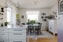 Det stilrena köket är smakfullt i vit köksinredning och som matchas snyggt med grå bänkskiva och vitt kakel. Köket har bra med arbetsytor och gott om skåpsförvaring. Kök, matdel och vardagsrum integreras på ett naturligt och smart sätt. Den maskinella köksutrustningen består av spishäll, ugn, fläkt, diskmaskin samt kyl och frys i fullhöjd.