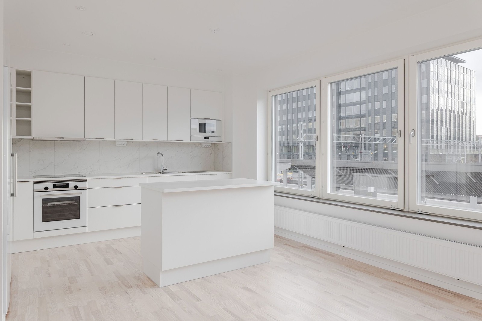 Köket är ljust och modernt med öppna ytor och en funktionell layout. En praktisk köksö står centralt i rummet och fungerar både som arbetsyta och social samlingspunkt. Skåpen är stilrent designade med smarta förvaringslösningar vilket gör det enkelt att hålla ordning. Köket har stora fönster som släpper in rikligt med naturligt ljus och arbetsytorna är välplanerade för att ge maximal funktionalitet. Den maskinella köksutrustningen består av inbyggd mikrovågsugn, integrerad diskmaskin, ugn, spishäll, spisfläkt samt kyl och frys i fullhöjd.